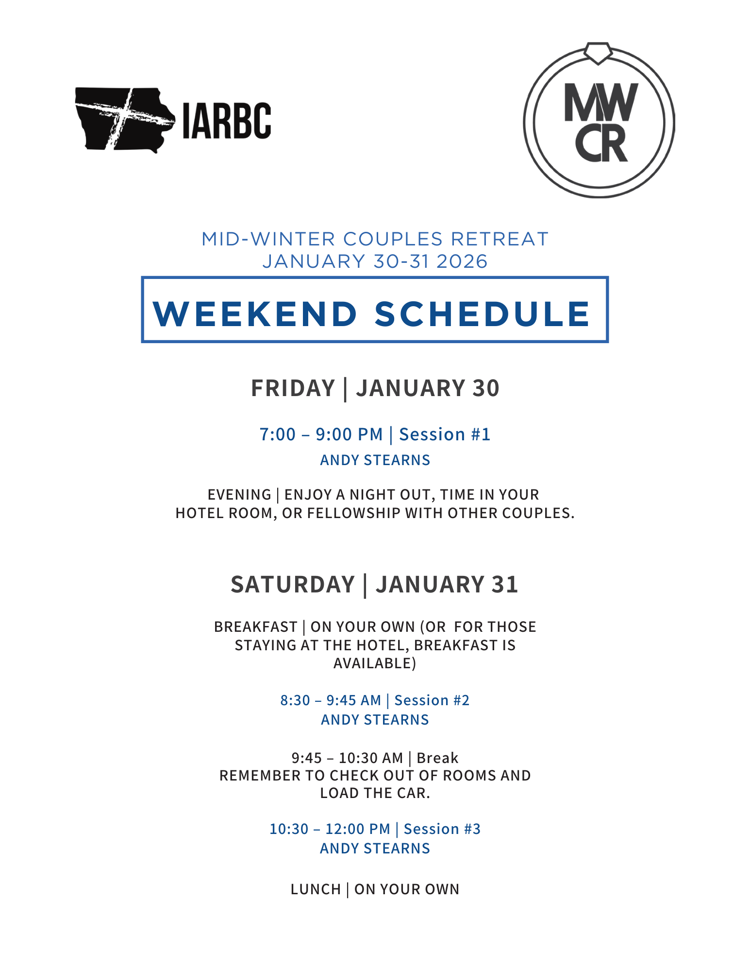 Take a break from the busyness of life and invest in your marriage at this year’s Mid-Winter Couple’s Retreat! We’ll be gathering at our new location—the Holiday Inn Airport in Des Moines — a beautiful setting to relax, reconnect, and enjoy fellowship with other couples. Make plans now to attend! You won’t want to miss this special time away together!