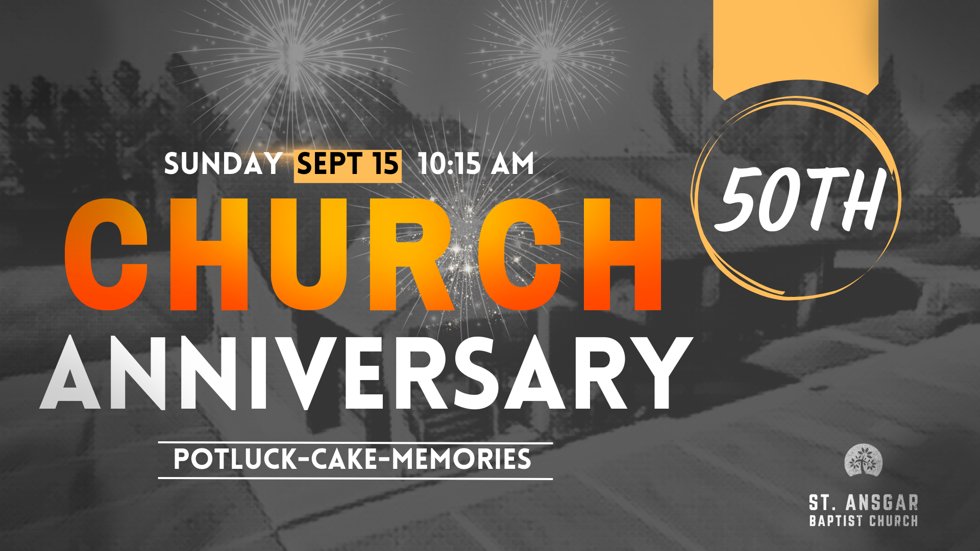 St. Ansgar Baptist Church 50th Anniversary Celebration Sunday, September 15, 2024 10:15 AM 2:15 PM Google Calendar ICS Saint Ansgar Baptist Church would like to invite you to their upcoming 50th Anniversary Celebration! All who have been part of Saint Ansgar Baptist Church or who have had family in St. Ansgar Baptist Church are invited to attend.