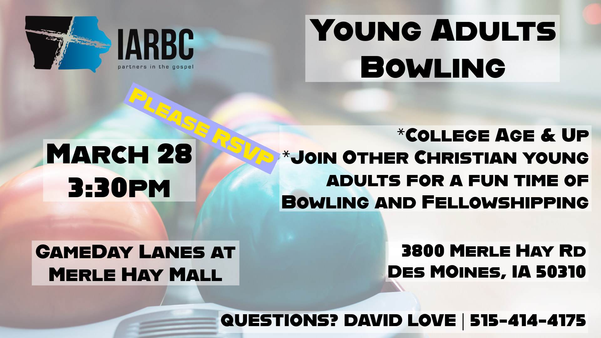Back to All Events Young Adults Bowling Event Saturday, March 28, 2026 3:30 PM 5:30 PM Google Calendar ICS